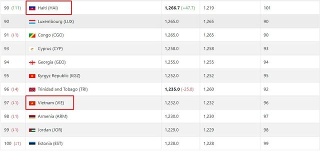 Nhờ đó, Haiti đã có bước nhảy vọt thần kỳ khi tăng từ vị trí thứ 101 lên thứ 90 thế giới. Chính bởi sự nhảy vọt của Haiti, đội tuyển Việt Nam đã tụt 1 bậc xuống hạng 97 thế giới.