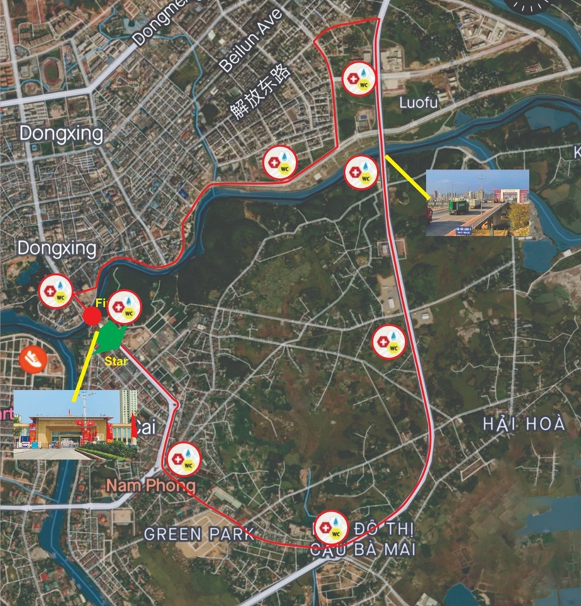 | Sơ đồ đường chạy giao lưu hữu nghị quốc tế Móng Cái (Việt Nam) - Đông Hưng (Trung Quốc). |