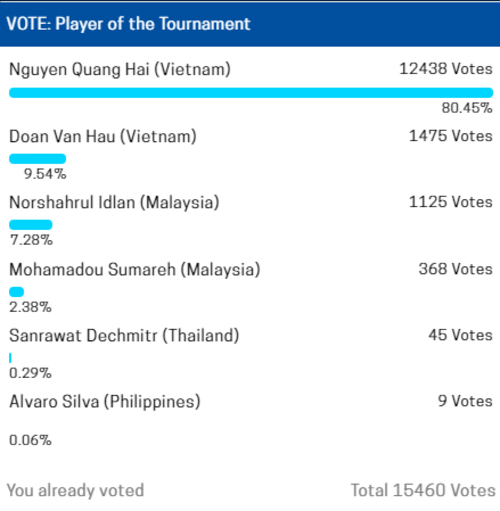 Tính đến sáng nay 19/12, Quang Hải nhận được 12.438 trong tổng số 15.460 lượt bình chọn, chiếm 80,45%. Đây là kết quả không bất ngờ vì trước đó, tiền vệ của Việt Nam đã nhận danh hiệu Cầu thủ hay nhất AFF Cup 2018. Giải thưởng chính thức này được ban tổ chức trao cho Quang Hải ngay sau khi trận chung kết lượt về với Malaysia kết thúc trên sân Mỹ Đình.