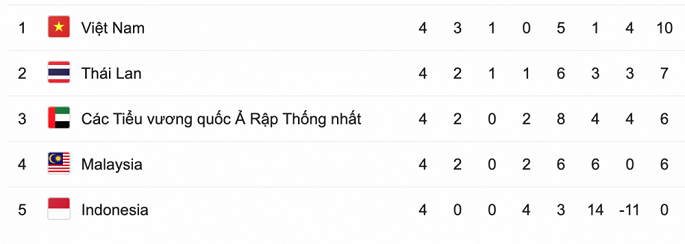Cùng với việc Thái Lan bất ngờ thất bại 1-2 trên sân Malaysia ở trận đấu trước đó, thầy trò HLV Park Hang-seo tạm vươn lên dẫn đầu bảng G với 10 điểm sau 4 trận. Thái Lan xếp thứ hai với 7 điểm, UAE vẫn giữ nguyên vị trí thứ ba (6 điểm). Ngày 19/11 tới, ĐT Việt Nam sẽ tiếp ĐT Thái Lan trên sân nhà Mỹ Đình.
