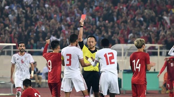 | Trận đấu rơi vào thế “ru ngủ” không có nhiều tình huống đáng chú ý, cho đến khi xảy ra bước ngoặt ở phút 37. Khalifa Alhammadil truy cản Tiến Linh từ phía sau trong giây phút hiếm hoi tuyển Việt Nam áp sát khung thành UAE và phải nhận thẻ đỏ trực tiếp từ trọng tài. |