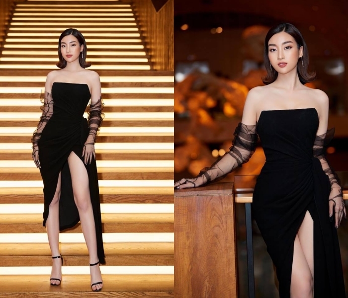 | Đỗ Mỹ Linh cũng nhận được nhiều lời khen ngợi từ người hâm mộ khi diện một thiết kế đầm xẻ lệch dài tới mắt cá chân. Nhưng thay vì màu trắng, cô lựa chọn tông màu đen với đường cắt cúp vuông vức trước ngực. Nàng hậu kết hợp cùng găng tay dài vải voan với những đường xếp ấn tượng. |