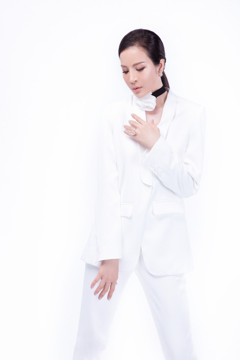 | Với màu sắc sáng của bộ vest, Thanh Mai khéo léo tạo điểm nhấn bằng vòng choker hoa hồng ở cổ. |