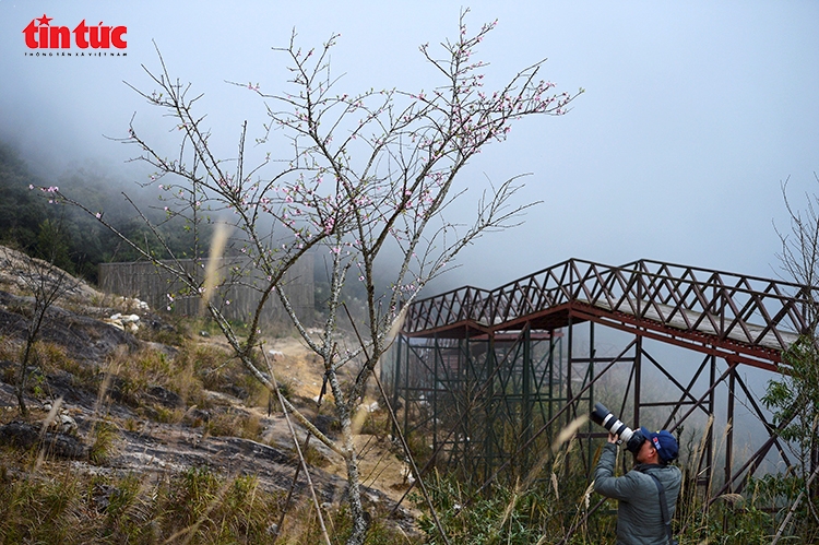 | Nhiếp ảnh gia ghi lại khoảnh khắc đào rừng nở hoa bên lối đi tham quan tại Khu du lịch Cổng Trời Ô Quy Hồ. |