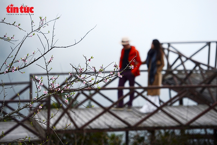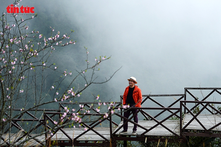 | Du khách tản bộ trên cầu gỗ, ngắm sắc đào rừng nở giữa không gian mây núi hùng vĩ. |