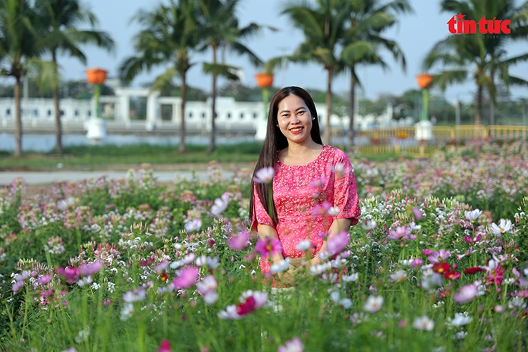 | Chị Đỗ Thủy (ngụ phường Hiệp Bình) chụp ảnh bên những bông hoa đang khoe sắc. |