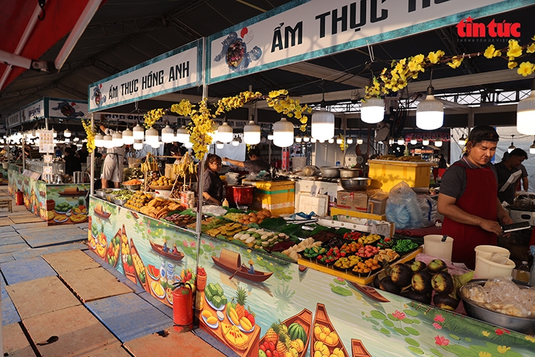 | Hàng trăm gian hàng ẩm thực truyền thống ba miền, giới thiệu nhiều món ăn đặc trưng ngày Tết phục vụ du khách khi tham quan vườn hoa. |