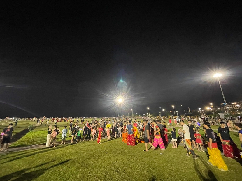 | Rất đông người dân đổ về quảng trường trong đêm đầu tiên TP Hạ Long mở lại một số dịch vụ. |
