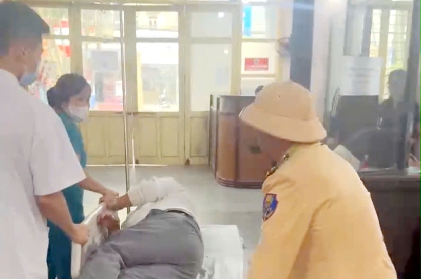 | Tổ công tác đưa anh Đào Văn Đạo vào bệnh viện cấp cứu kịp thời. Ảnh: Cắt từ clip do Cục CSGT cung cấp. |