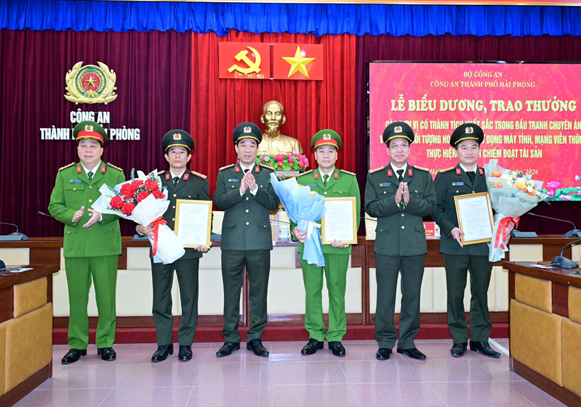 Sáng 9/2/2026, Công an TP Hải Phòng tổ chức lễ biểu dương, trao thưởng các tập thể có thành tích xuất sắc trong đấu tranh chuyên án liên quan nhóm đối tượng sử dụng mạng máy tính, mạng viễn thông và phương tiện điện tử để chiếm đoạt tài sản, vi phạm quy định về kinh doanh theo phương thức đa cấp. Tại buổi lễ, Công an TP Hải Phòng đã công bố Thư khen và Quyết định khen thưởng đột xuất của Bộ Công an đối với các tập thể có thành tích xuất sắc trong đấu tranh chuyên án nêu trên.