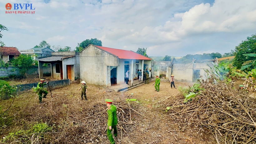 | Lực lượng Công an xã Vân Du cùng chính quyền địa phương, các nhà hảo tâm hỗ trợ dọn dẹp, sắp xếp lại nhà cửa cho gia đình bà Lê Thị Thanh. |