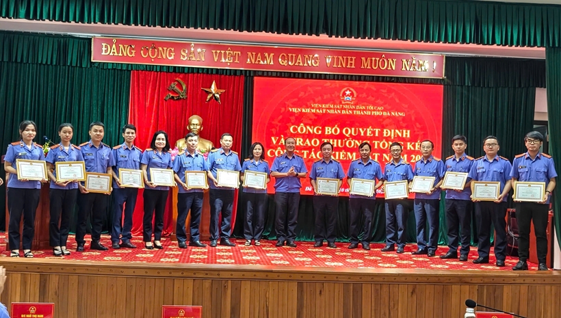| Phóng viên Dư Xuân Nha (thứ 4 từ trái qua) nhận Giấy khen của Viện trưởng VKSND TP Đà Nẵng năm 2025. |