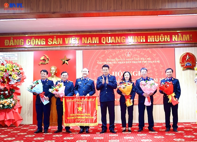 | Đồng chí Nguyễn Huy Tiến, Viện trưởng VKSND tối cao trao Cờ thi đua của Chính phủ tặng tập thể lãnh đạo VKSND thành phố Đà Nẵng tại Hội nghị triển khai công tác năm 2026 của đơn vị. (Ảnh minh hoạ) |