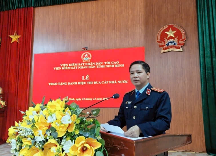 | Đồng chí Trần Quốc Hoàn, Phó Viện trưởng VKSND tỉnh Ninh Bình công bố Quyết định tặng thưởng Huân chương Lao động hạng Nhất và danh hiệu Chiến sĩ thi đua toàn quốc. |
