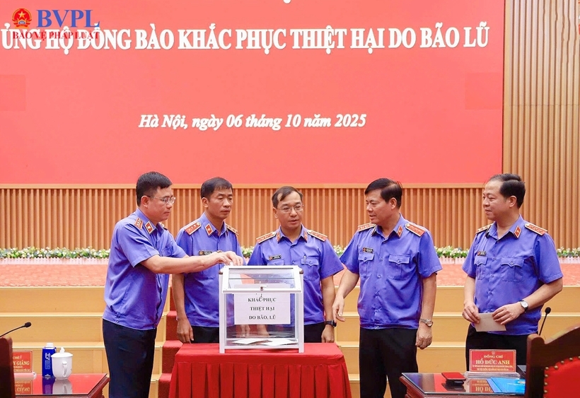 | Tập thể lãnh đạo VKSND tối cao tham gia quyên góp, ủng hộ đồng bào bị thiệt hại do cơn bão số 10 gây ra. Ảnh: PV |