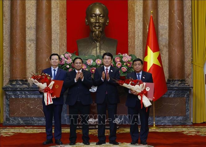 | Chủ tịch nước Lương Cường trao Quyết định bổ nhiệm, Thủ tướng Phạm Minh Chính tặng hoa chúc mừng Phó Thủ tướng Nguyễn Chí Dũng và Mai Văn Chính. Ảnh: Lâm Khánh/TTXVN |