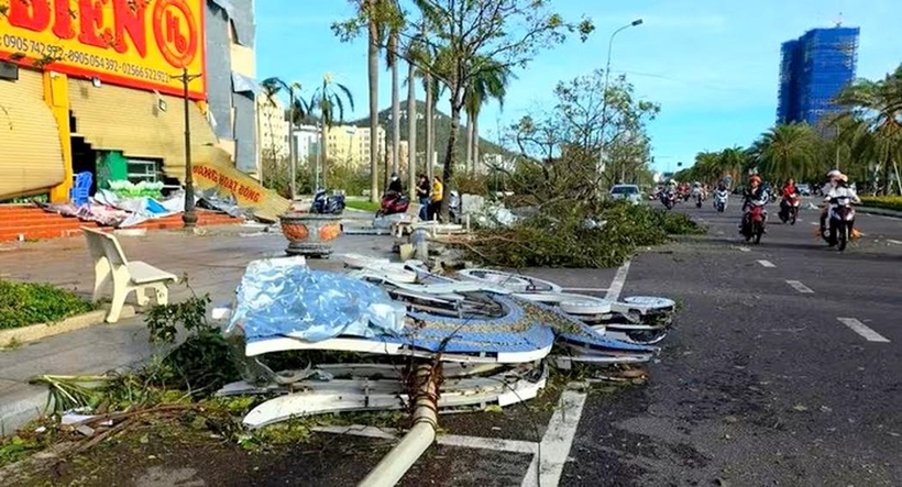 | Sau một đêm bị bão quần thảo, sáng sớm nay, đường phố Quy Nhơn, tỉnh Gia Lai ngổn ngang cây đổ. Nhiều công trình, nhà cửa bị hư hại, kính văng tung tóe khắp nơi. |