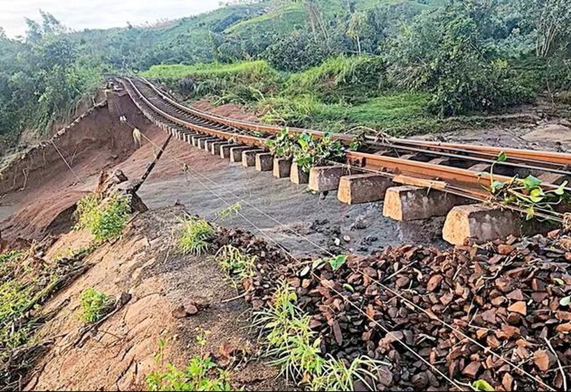 | Do ảnh hưởng của bão số 13, một đoạn nền đường sắt đoạn Đắk Lắk và Gia Lai bị cuốn trôi hoàn toàn, chỉ còn trơ lại đường ray và tà vẹt lơ lửng trên không. |