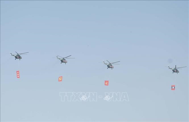 | Biên đội máy bay trực thăng mang cờ bay trên bầu trời khu vực tổ chức lễ kỷ niệm. Ảnh: Thống Nhất/TTXVN |