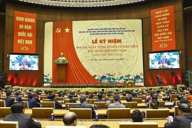 Hôm nay, trong không khí toàn Đảng, toàn dân, toàn quân ta đang ra sức thi đua lập thành tích chào mừng Đại hội đại biểu toàn quốc lần thứ XIV của Đảng, chúng ta long trọng tổ chức Lễ kỷ niệm 80 năm Ngày Tổng tuyển cử đầu tiên bầu ra Quốc hội của nước Việt Nam Dân chủ Cộng hòa, nay là nước Cộng hòa xã hội chủ nghĩa Việt Nam.