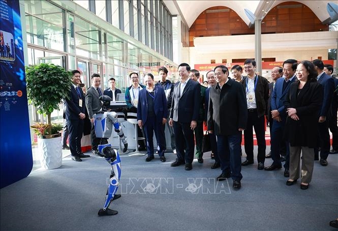 | Thủ tướng Phạm Minh Chính kiểm tra khu trung bày các sản phẩm khoa học công nghệ. Ảnh: Dương Giang/TTXVN |