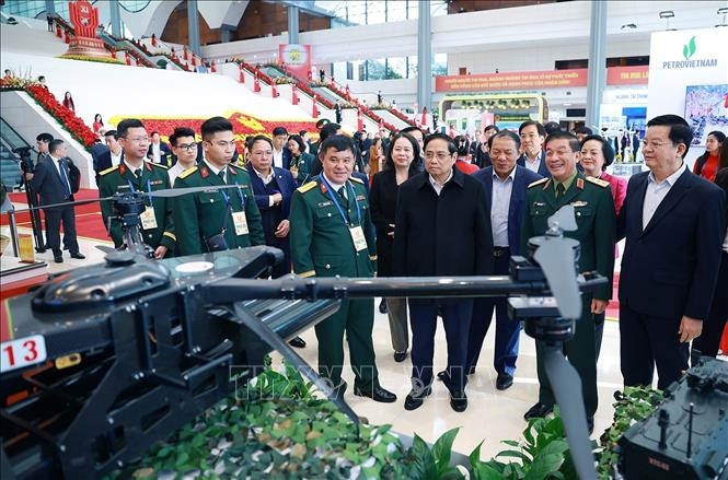 | Thủ tướng Phạm Minh Chính kiểm tra khu trưng bày khí tài quân sự. Ảnh: Dương Giang/TTXVN |