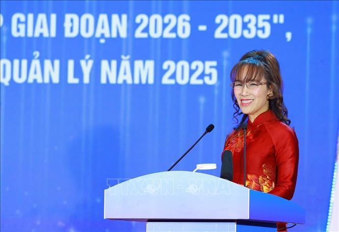 | Bà Nguyễn Thị Phương Thảo, Chủ tịch Tập đoàn Sovico tham luận "Tập đoàn Sovico hợp tác và hỗ trợ đồng hành triển khai Đề án Hỗ trợ phụ nữ khởi nghiệp giai đoạn 2026-2035". Ảnh: Dương Giang/TTXVN |