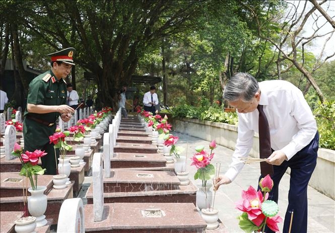 | Tổng Bí thư, Chủ tịch nước Tô Lâm thắp hương trên phần mộ các Anh hùng, liệt sĩ. Ảnh: Thống Nhất/TTXVN |