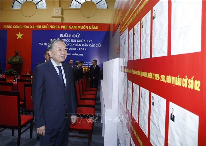 | Tổng Bí thư Tô Lâm xem danh sách các ứng cử viên được niêm yết tại Khu vực bỏ phiếu số 02 phường Ba Đình, thành phố Hà Nội. Ảnh: Thống Nhất/TTXVN |