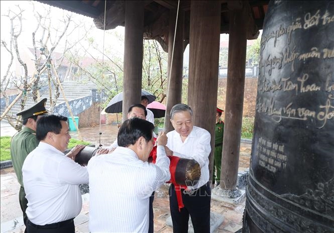 | Tổng Bí thư Tô Lâm thỉnh chuông tại Đền Chung Sơn. Ảnh: Thống Nhất/TTXVN |