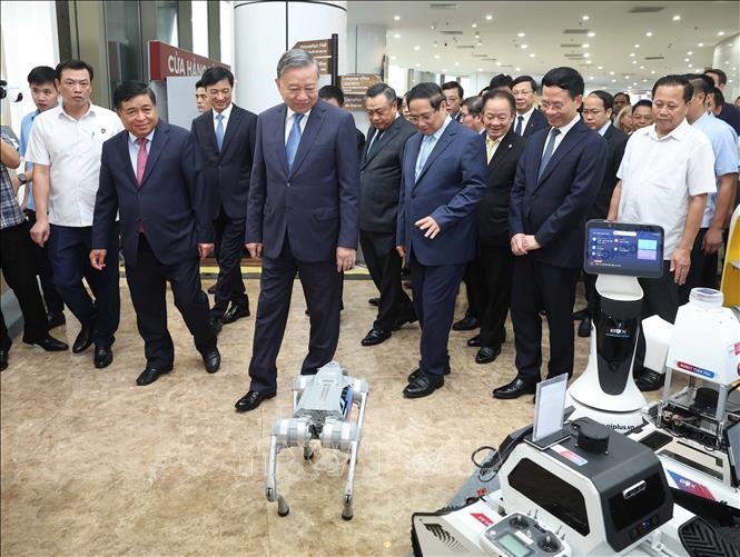 Tổng Bí thư Tô Lâm, Thủ tướng Phạm Minh Chính và các đại biểu tham quan các gian trưng bày sản phẩm công nghệ tại triển lãm. |
