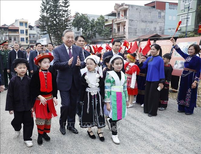 | Tổng Bí thư Tô Lâm với nhân dân các dân tộc tỉnh Cao Bằng. Ảnh: Thống Nhất/TTXVN |