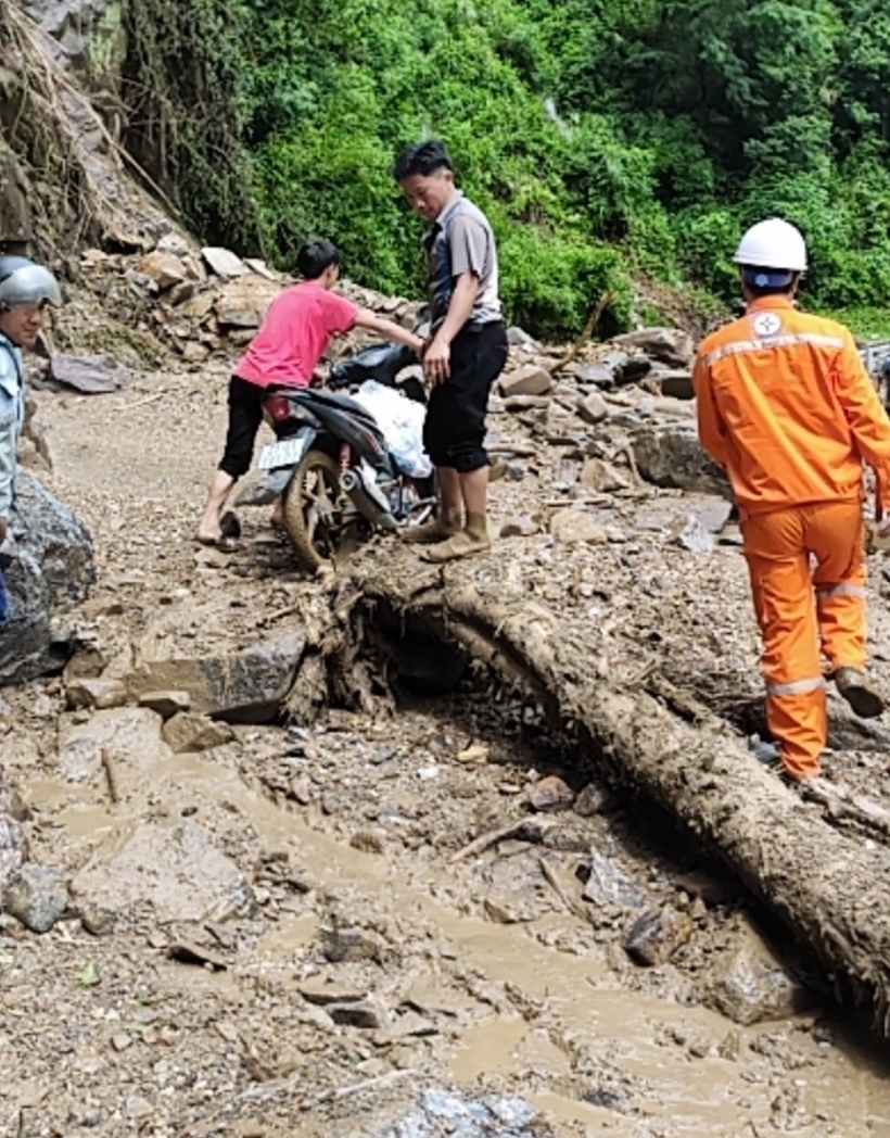 | Công nhân Điện lực tại Sơn La hỗ trợ người dân qua khu vực sạt lở. |