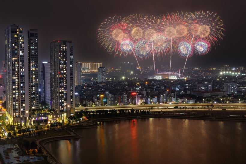 | Khoảnh khắc pháo hoa bùng nổ rực rỡ trên bầu trời thủ đô trong tối tổng duyệt 21/1. Ảnh: Sun Group |
