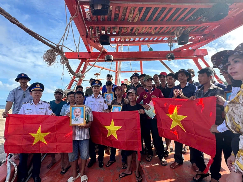 Nhân dịp này, Bộ Tư lệnh Vùng Cảnh sát biển 4 đã trao tặng nhiều phần quà ý nghĩa cho chủ tàu và thuyền viên như cờ Tổ quốc, ảnh Bác Hồ, túi thuốc y tế và tài liệu pháp luật. Những phần quà tuy không lớn về giá trị vật chất nhưng mang ý nghĩa tinh thần sâu sắc, thể hiện sự đồng hành của lực lượng Cảnh sát biển với ngư dân trong hành trình bám biển, phát triển kinh tế và giữ gìn chủ quyền.