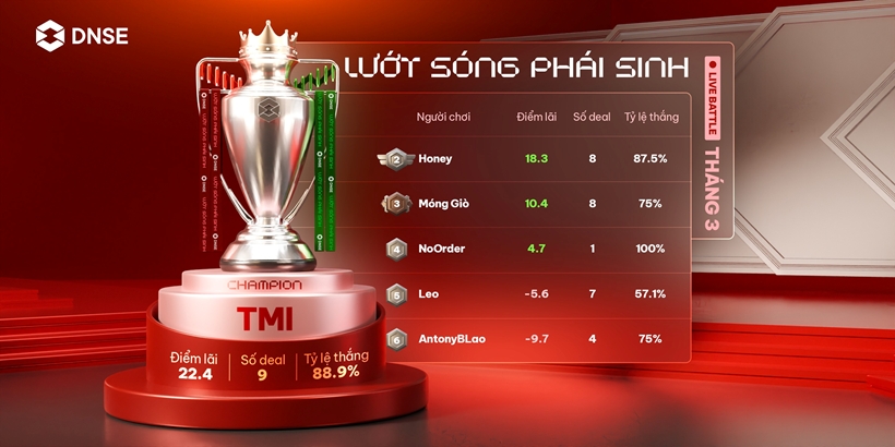 | Bảng xếp hạng cuộc thi Live Battle - Lướt sóng phái sinh tháng 3 của DNSE. |