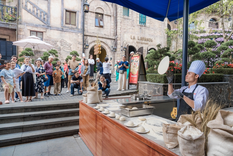 Đáng chú ý, các gian hàng ẩm thực nay đã được nâng tầm thành những “show diễn đa giác quan” đầy lôi cuốn. Từ trạm kebab thơm lừng nức mũi, quầy hotdog rộn rã, đến những gian bánh ngọt ngào hay bếp nướng xúc xích Bà Nà trứ danh - tất cả đan cài thành một bức tranh ẩm thực đường phố châu Âu đầy mê hoặc. Du khách có thể trực tiếp dõi theo từng công đoạn chế biến ngay trước mắt: nghe tiếng xèo xèo vui tai, ngửi mùi hương quyến rũ, chiêm ngưỡng những thao tác điêu luyện của đầu bếp rồi mới thong thả chạm đến hương vị. Bầu không khí lễ hội nhờ thế trở nên vô cùng gần gũi, xóa nhòa mọi khoảng cách, nơi tất cả du khách đều có thể hòa mình, kết nối và chia sẻ niềm vui bất tận.