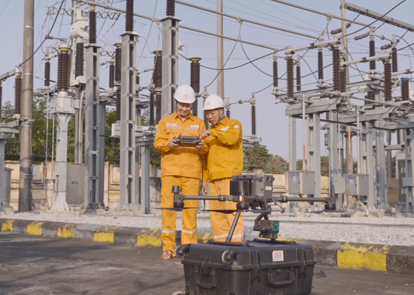 | Nhân viên Điện lực EVNNPC điều khiển thiết bị UAV ngoài hiện trường. |