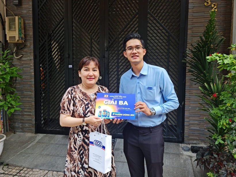 | Chị Minh Hải bất ngờ khi được nhãn hàng JEX trao thưởng ngay tận nhà. Ảnh: ECO Green |