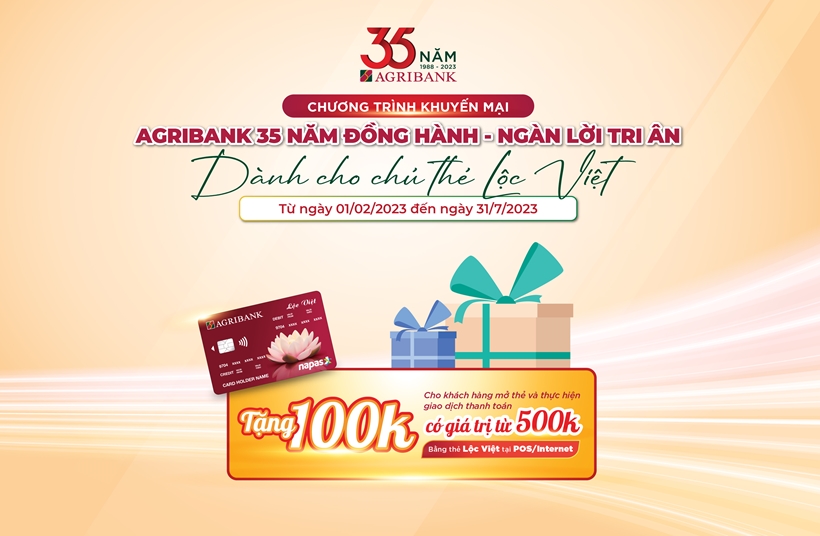 Từ ngày 01/02/2023 đến hết ngày 31/7/2023, 20.000 khách hàng phát hành mới thẻ Lộc Việt và có thực hiện giao dịch thanh toán hàng hóa, dịch vụ sớm nhất có giá trị từ 500.000 VND trở lên bằng thẻ Lộc Việt (thẻ tín dụng Lộc Việt hoặc thẻ ghi nợ Lộc Việt) được nhận 100.000 đồng