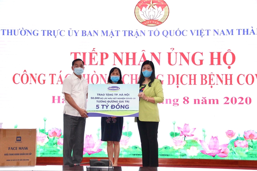 Trong ngày 11/8/2020, bà Nguyễn Thị Minh Tâm, Giám đốc Chi nhánh Vinamilk tại Hà Nội đã đại diện Công ty trao tặng 50.000 bộ lấy mẫu xét nghiệm cho đại diện của Sở Y tế và Mặt trận Tổ quốc TP Hà Nội. Tại buổi tiếp nhận ủng hộ công tác phòng chống dịch COVID-19, ông Nguyễn Khắc Hiền - Giám đốc Sở Y tế Hà Nội cho biết: “Việc Vinamilk hỗ trợ mẫu xét nghiệm có ý nghĩa rất lớn cho Hà Nội, bổ sung lượng mẫu xét nghiệm đang còn thiếu hiện nay, đảm bảo cho Hà Nội có đủ 80 nghìn mẫu xét nghiệm PCR. Nếu các đơn vị liên quan thực hiện việc giao mẫu đúng tiến độ thì mỗi ngày Hà Nội sẽ có thể xét nghiệm 10 nghìn mẫu để tăng cường khoanh vùng dập dịch".