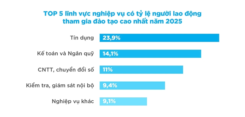 Nội dung đào tạo trải rộng từ nghiệp vụ chuyên sâu đến kỹ năng số: tín dụng, kế toán - ngân quỹ, quản lý rủi ro, CNTT, an toàn thông tin, phân tích dữ liệu, IFRS, Agile, BA, AI ứng dụng trong giảng dạy và vận hành… Trong đó, tín dụng, kế toán - ngân quỹ, chuyển đổi số, kiểm tra giám sát nội bộ là những nhóm lĩnh vực có tỷ lệ tham gia đào tạo cao nhất.