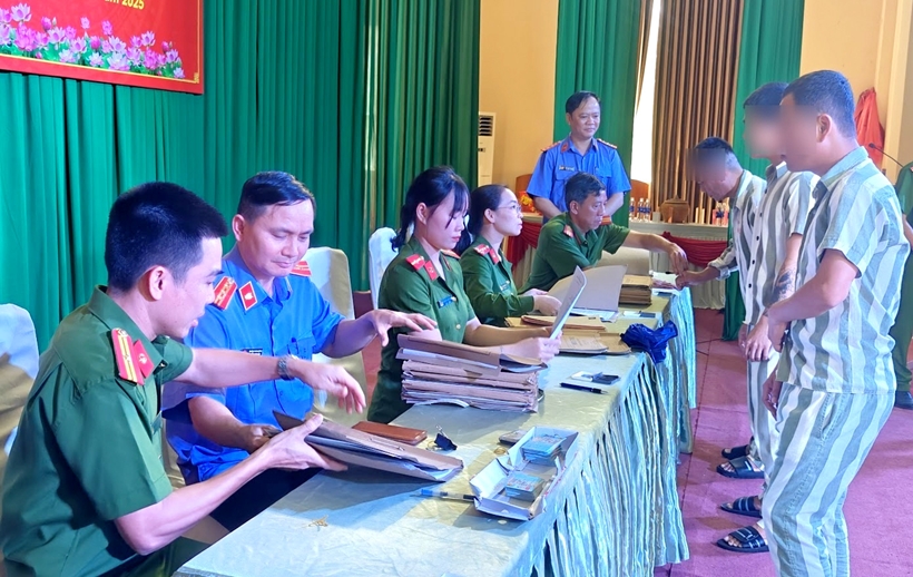 | Cán bộ VKSND tối cao kiểm sát việc trả căn cước công dân cho những phạm nhân được đặc xá dịp 30/4/2025 tại Trại giam Bình Điền. |
