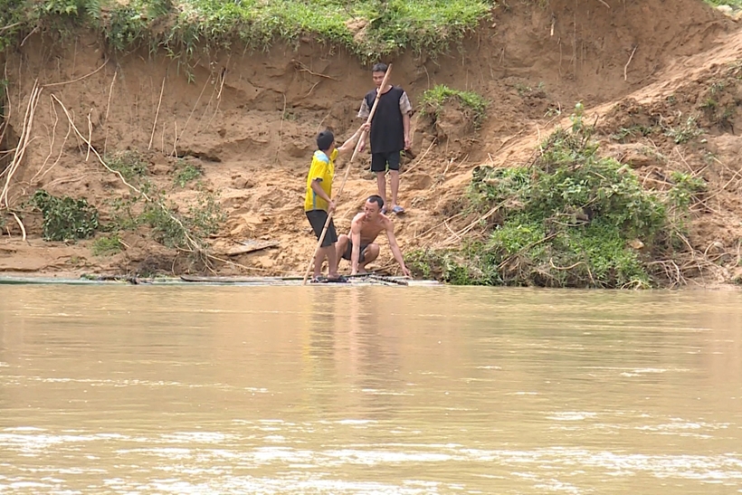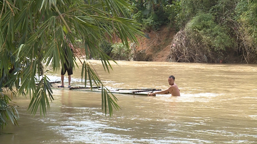 Để đi lại, người dân địa phương đã phải làm bè mảng tạm bợ để qua sông. Việc di chuyển này tiềm ẩn nhiều rủi ro, đe doạ tính mạng của người dân.