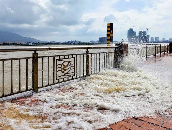 Nước sông Hàn tại TP Đà Nẵng dâng cao và sóng lớn, cao hơn 3m liên tục đánh mạnh vào bờ kè. |