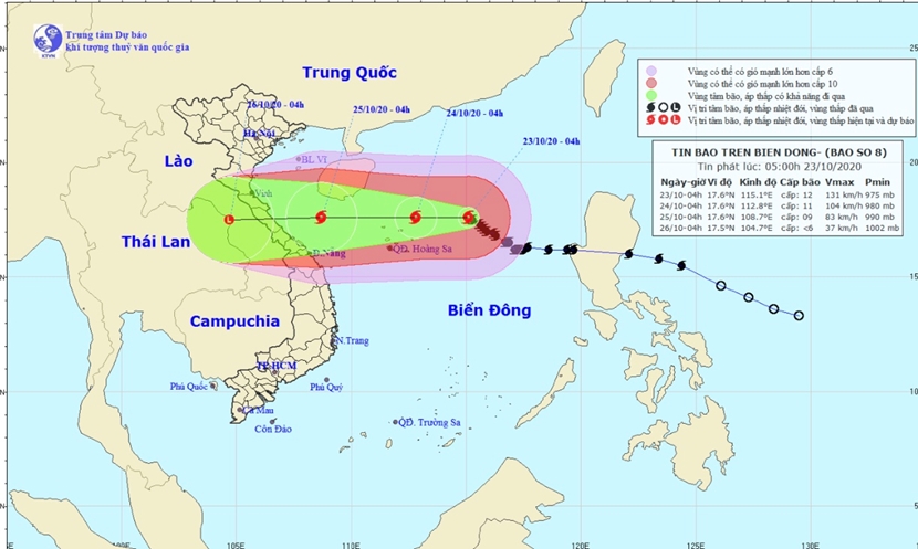 Dự báo trong 24 giờ tới, bão di chuyển theo hướng Tây Tây Bắc, mỗi giờ đi được khoảng 5-10km. Đến 04 giờ ngày 24/10, vị trí tâm bão ở khoảng 17,6 độ Vĩ Bắc; 112,8 độ Kinh Đông, cách quần đảo Hoàng Sa khoảng 100km về phía Bắc Đông Bắc. Sức gió mạnh nhất vùng gần tâm bão mạnh cấp 11 (100-115km/giờ), giật cấp 13.