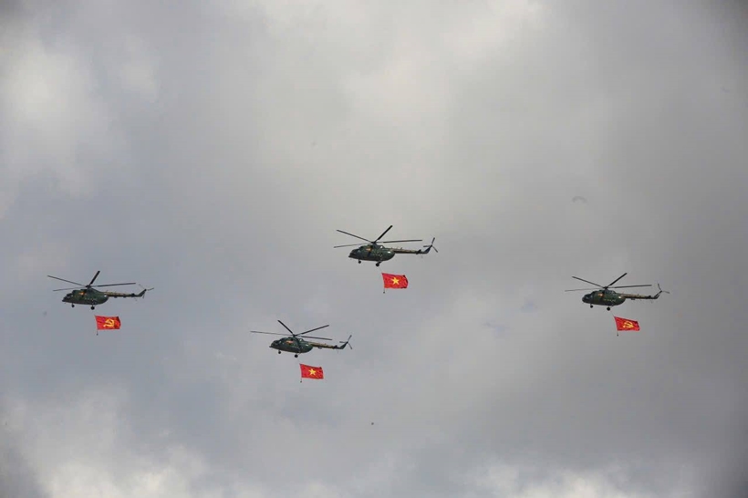 | Trong buổi sáng, đội hình 10 trực thăng được chia thành ba biên đội, theo đội hình 3-4-3, giữ khoảng cách bảo đảm an toàn và tính đồng bộ. |