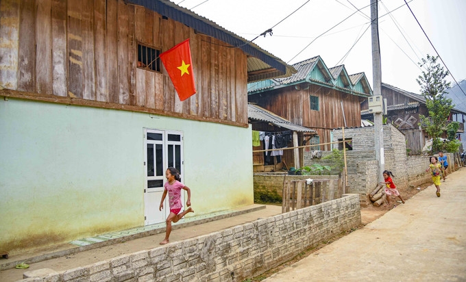 | Trẻ em vui chơi bên những ngôi nhà kiên cố và con đường bê tông hóa. |