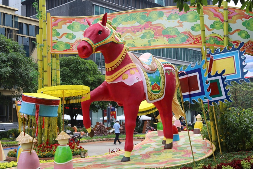 | Đường hoa Tết 2026 vẫn giữ vững giá trị cốt lõi là lòng tự hào dân tộc qua các hình tượng lịch sử như ngựa sắt Thánh Gióng hay ngựa chiến Tây Sơn – những biểu tượng của sức mạnh và bản lĩnh Việt Nam. |
