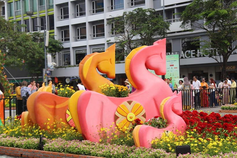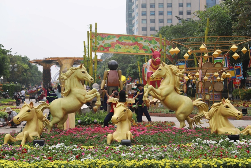 | Nổi bật tại đường hoa năm nay là linh vật ngựa lấy cảm hứng từ hình tượng Thánh Gióng cưỡi ngựa bay về trời. Công trình cao 11m, được thiết kế có thể cử động đầu và chân, tạo hiệu ứng sinh động, thu hút người dân tham quan, chụp ảnh. |